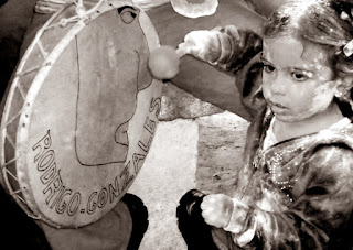 EL BAUTISMO DE LA GUAGUA: Para el bautismo previamente se ha carneado un animal para el banquete. Se ha adornado también un arco (aunque en algunos lugares se adorna hasta cuatro de estos arcos) con palmas, cañas, flores, cintas de papel, frutas como higos, duraznos, quesillos, trozos de melones, sandías, mashacos, etc. El cura vuelca el vino sobre la guagua sostenida por los padrinos (cuma y cumpa), en algunos casos diciendo: “Carnaval yo te bautizo Con agua de granizo Por que sois Hijo de padres mestizos”. (Copla extraída de “La celebración del Carnaval en La Rioja” de Julián C. Freyre) Una vez bautizada la guagua, que es un muñeco de quesillo de cabra, mashaco o puede ser también de masa de harina tipo pan, comienza la algarabía y los festejos. Se ha bendecido el fruto de la cosecha y es hora de festejar. Todo este ritual es acompañado al son de los tambores y cantos de los vidaleros. Acto seguido al Bautismo los invitados podrán servirse de los frutos que adornan el arco y de la comida preparada de antemano.